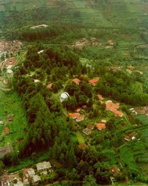 Foto udara Observatorium Bosscha di tahun 1980an. Sebuah oase ilmu pengetahuan di tengah kehijauan. Sumber: Observatorium Bosscha. |