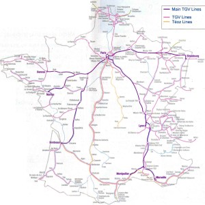 Sifat Perancis yang Paris-sentris ini semakin kentara apabila kita melihat peta jalur kereta cepat (TGV, Train ร Grande Vitesse atau Kereta Kecepatan Tinggi) Perancis. Jalur utama TGV menyerupai jeruji-jeruji sepeda yang menjurus radial dari poros sepeda tersebut, yaitu Paris. Perjalanan dari Paris menuju kota manapun yang dilalui TGV dapat dicapai maksimal 4 jam (Paris ke Marseille saya tempuh selama 3.5 jam naik TGV, sementara Paris ke Tours kira-kira 1 jam), namun perjalanan dari satu jeruji ke jeruji lainnya (misalnya dari Bordeaux ke Lyon) bisa makan banyak waktu lama karena harus ditempuh dengan kereta lokal yang lamanya bukan main. Terkadang supaya lebih cepat bahkan kita harus pergi ke Paris dulu lalu pindah kereta di situ.