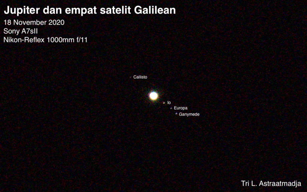 Tanpa pemikul yang bisa mengikuti gerak benda-benda langit, lensa 1000 mm saya tidak berdaya memotret planet-planet, namun saya tetap mencoba memotret Jupiter. Hasilnya lumayan, perbesaran gambar menunjukkan empat satelit Galilean sebagai empat titik di samping Jupiter.